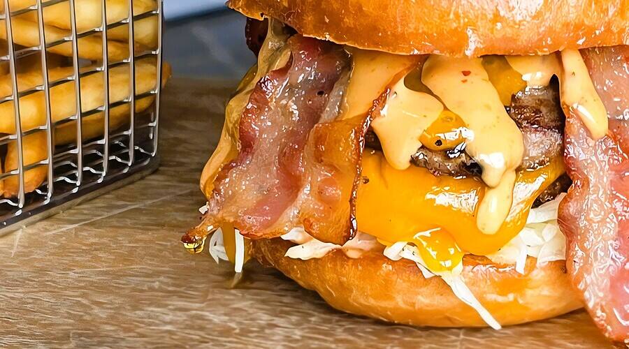 Two 3oz Burger Patties, Brioche Bun, Cajun Aioli, Tomato Jam, Harissa Mayo, Bacon, Lettuce, Cheddar Cheese, and Celeriac Slaw.