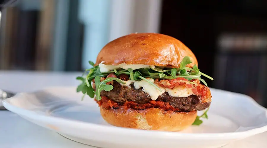 6-oz truffled beef patty, whipped asiago, sundried tomato bone marrow pesto, crispy pancetta, lemon garlic mayo and arugula on a potato bun. Make a full meal with fries for $4 more.