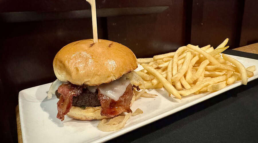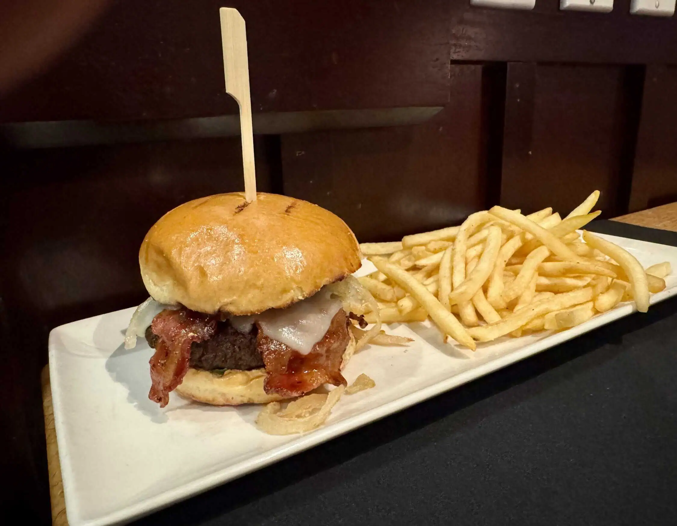 7oz. Beef patty topped with spicy candied bacon, seasoned crispy onions, monterey jack cheese, maple chipotle mayo and zesty arugula on a toasted buttery brioche bun. Served with a side of french fries.