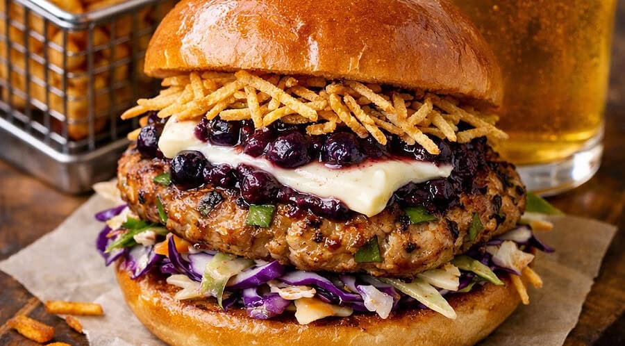Gilafi sheek kebab, Blueberry chutney, Amul cheese, potato salli, pickled cabbage slaw, Brioche bun.