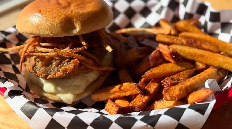 La Poutine Burger, our house made 6oz patty, topped with melted cheese curds, fried gravy disk, homemade ketchup and crispy fry strips