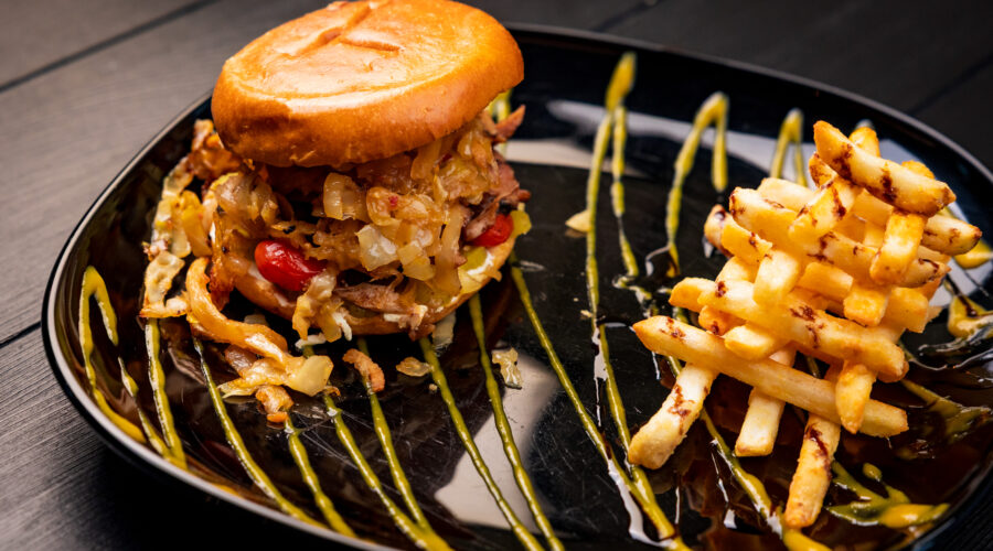 Jerk chicken with goat cheese, pineapple, cherry tomato, fried onion, homemade dill pickles, stewed cabbage and side of fries with a side of fries. Gluten free available.