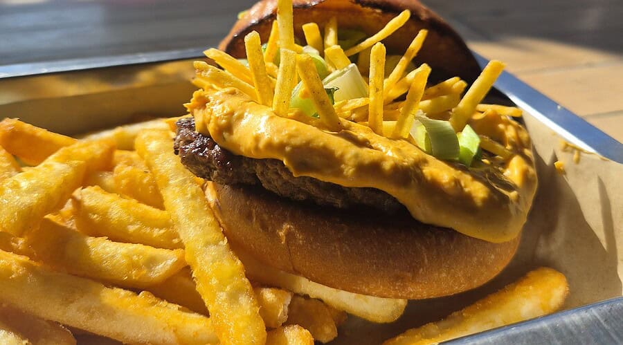 1/2lb Certified Angus burger with Buffalo cheese sauce, fresh green onions and crunchy Hickory Sticks.