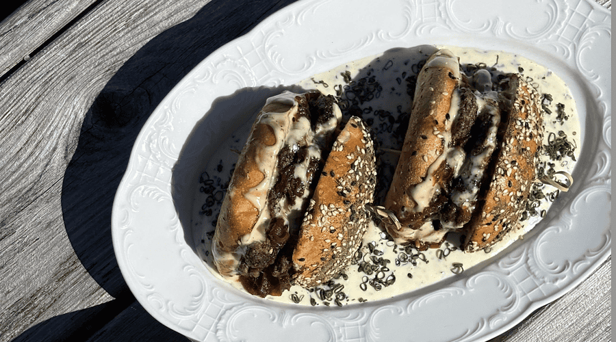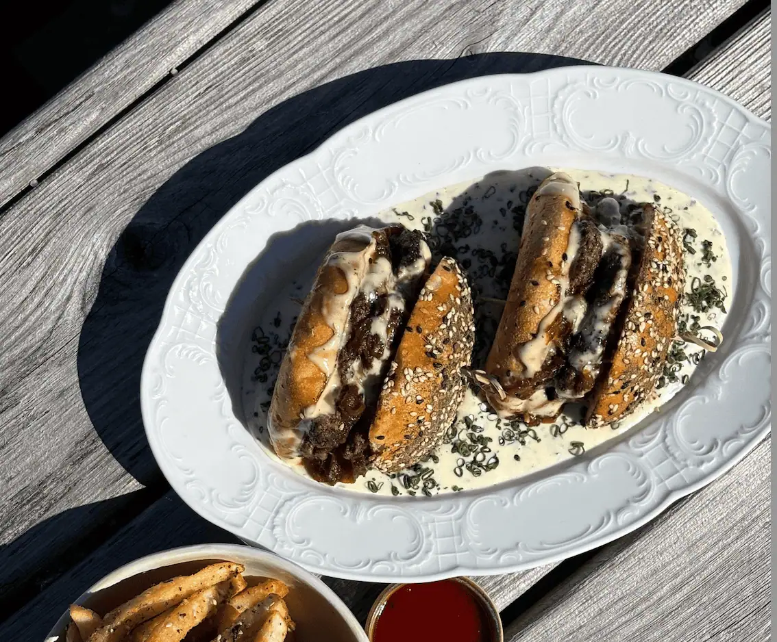 Adana-style lamb & beef patty, brushed with seasoned beef fat, caramelized onions, garlic aioli, smoked mushroom cheese sauce, on a brown butter brioche bun. Served sliced in half with choice of za’atar fries or kale fattoush salad.