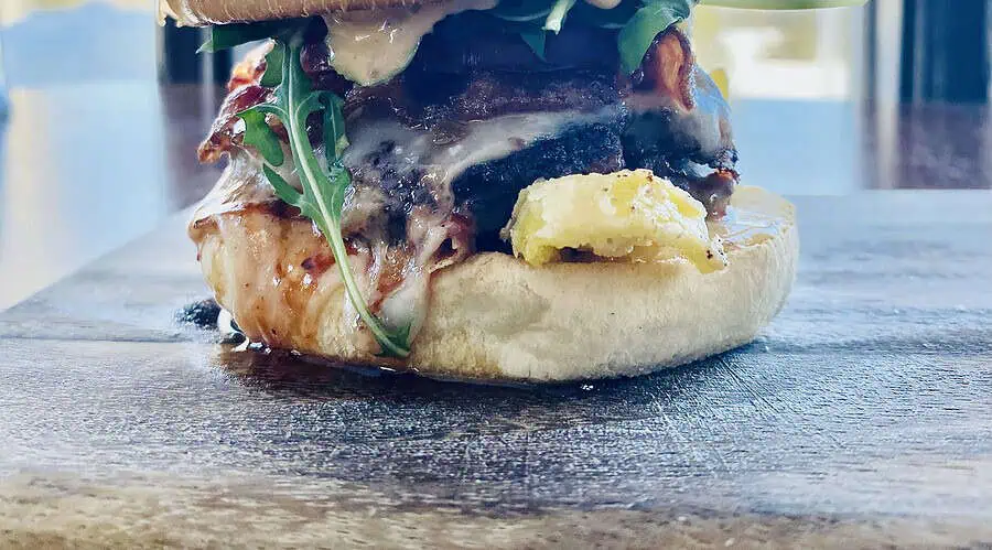 Sweet heat meets serious smash — double smash beef patties with Hellfire glaze, Swiss, maple candied bacon, crispy banana peppers, fresh tomato & arugula, finished with maple Bomba aioli on toasted brioche. Served with in house-cut fries.