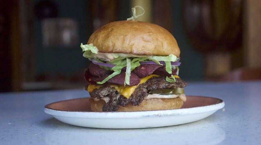 A 3oz. zesty seasoned smash patty topped with american cheddar and deep fried pepperoni, dressed with shredded iceberg lettuce, red onion, dill pickles, pickled jalapenos and a BBQ baconaise all on a butter toasted, classic burger bun.