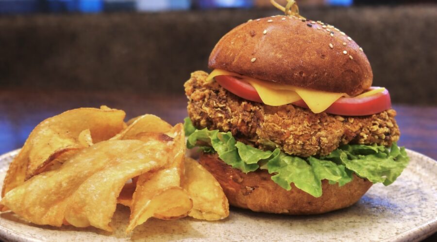 Buttermilk Fried Chicken, Spiced Mango & Black Garlic Aioli, Aged Cheddar, Pickled Red Onion, House-made Beet Infused Potato Bun