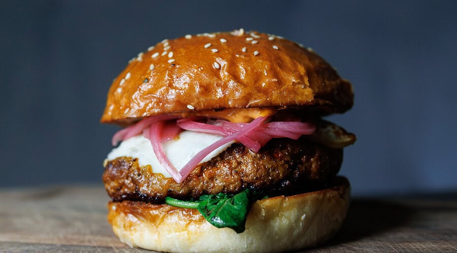 Soppressata spiced Pork & Beef Tenderloin burger, smoked mozzarella, sautéed spinach, Calabrian peperoncino & honey aioli, served on a housemade sesame brioche bun