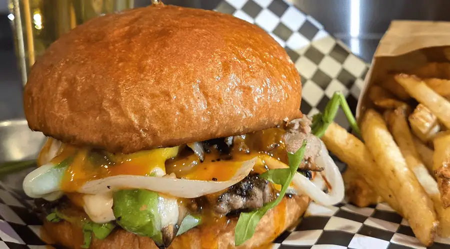 LOCALLY SOURCED GROUND BEEF BURGER (OULTON MEATS) TOPPED W/ SHAVED RIBEYE, SAUTEED ONIONS, PEPPERS, MUSHROOMS AND MELTED PROVOLONE CHEESE, FINISHED W/ OUR FANCY SAUCE ALL ON A BED OF CRUNCHY GREENS + A TOASTED BUN.