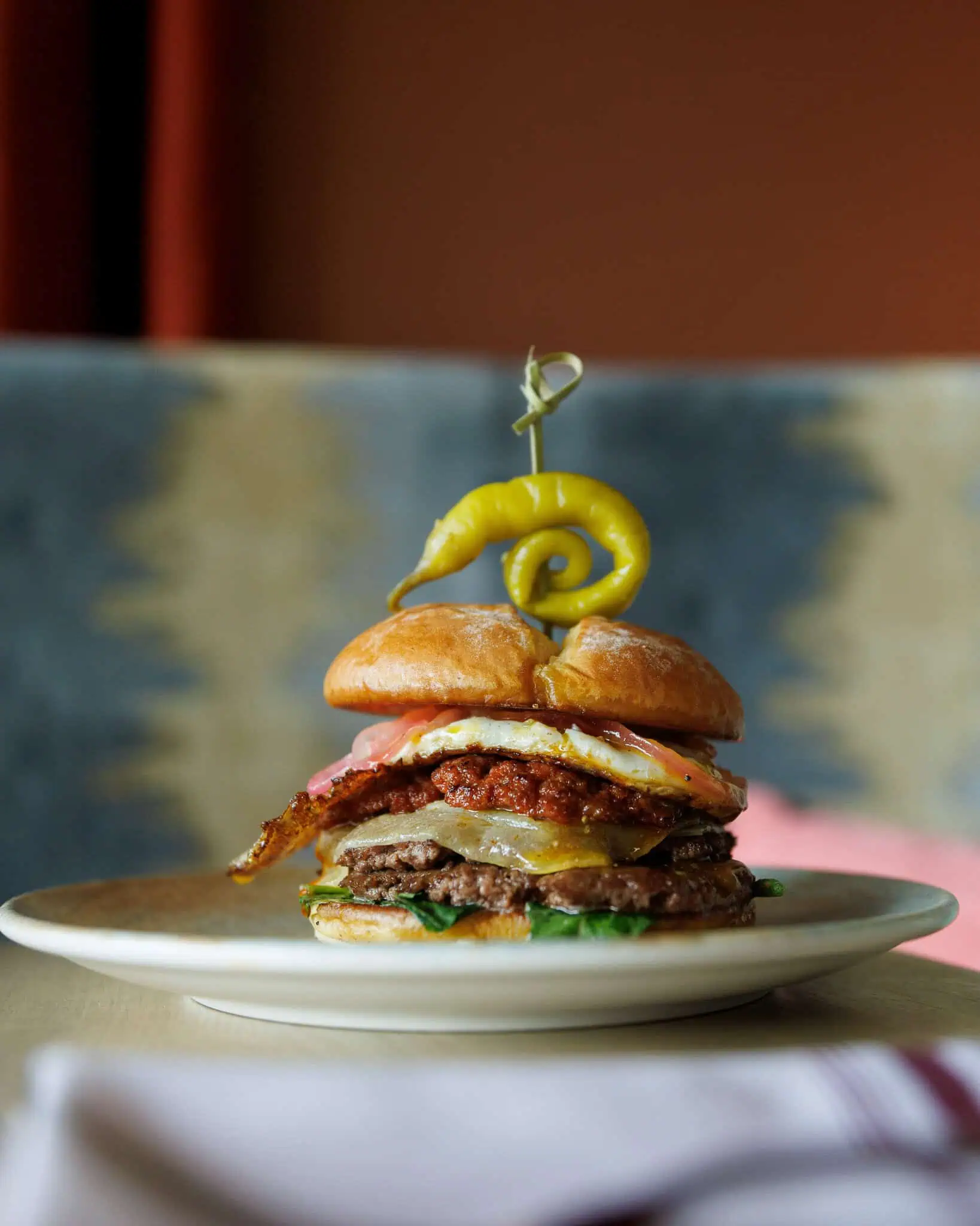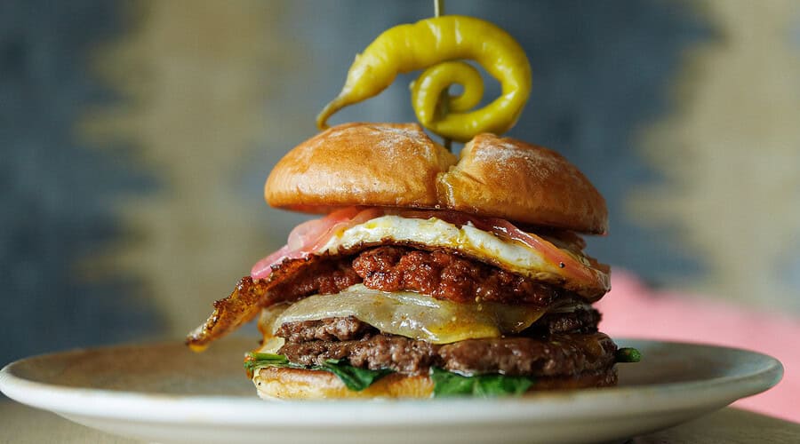 AAA Beef Tenderloin Smashburger, Sobrasada, fried free range egg, melted mahon cheese, red onion & watercress on a housemade potato bun, served with herbed patatas