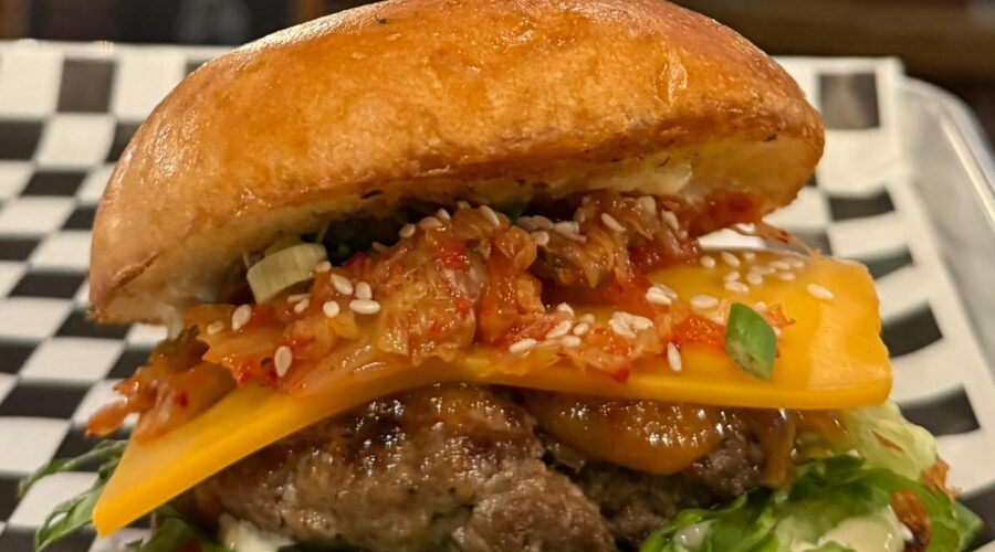 5 Oz smashed beef patty glazed in gochujang, crisp lettuce, juicy tomato, topped with caramelized kimchi, melted cheese, and garlic aioli on a toasted bun