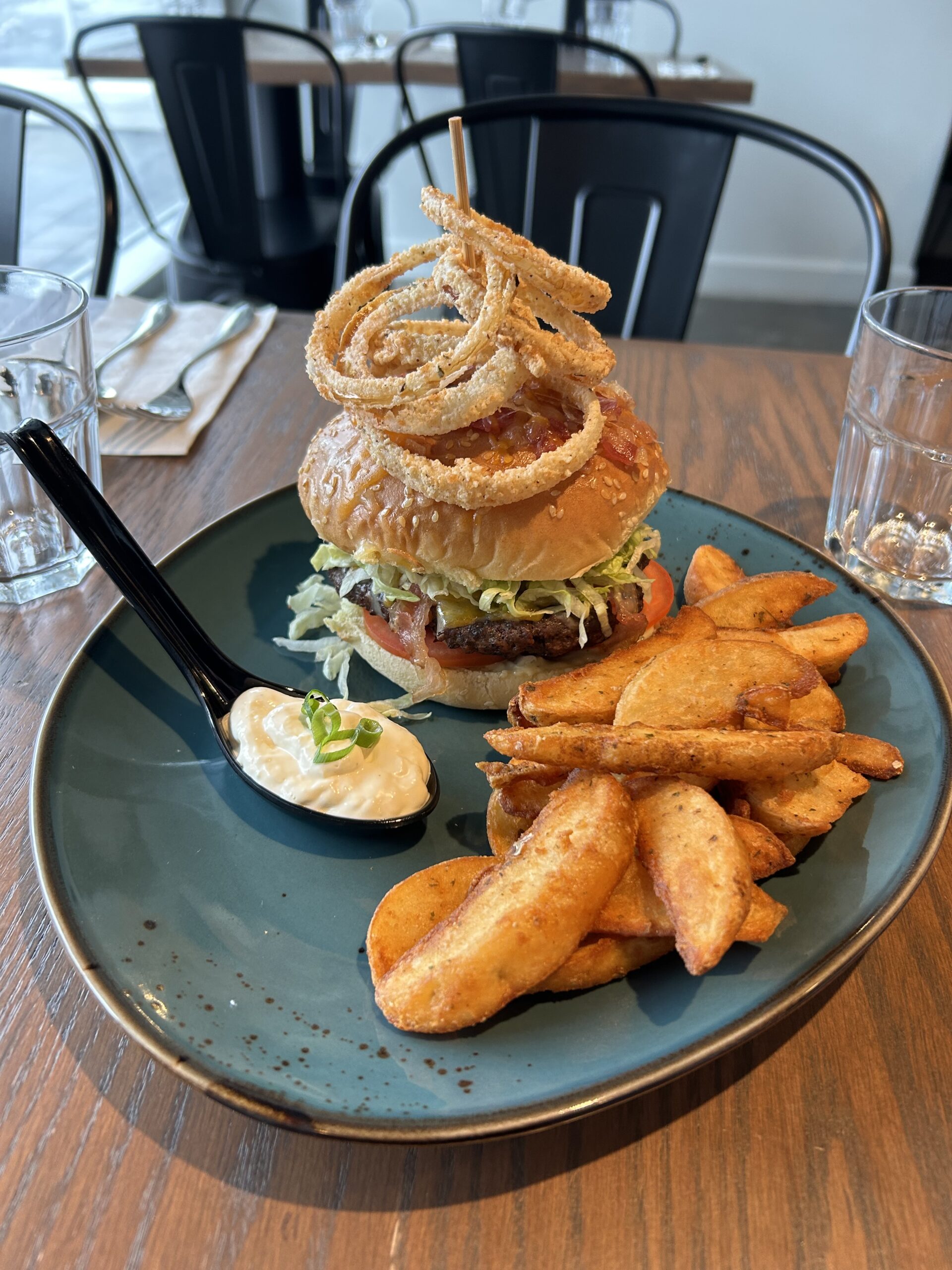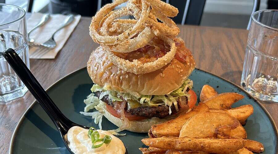 Our 6oz Grilled Beef Burger is done Sous Vide Style to Obtain the Perfect Temperature. The Bun is Smeared with a Dill Pickle Aioli, White Onion, Thinly Sliced Tomato and a Chiffonade of Lettuce. The Burger is Topped with Aged Cheddar and Hickory Smoked Bacon and House made Buttermilk Cajun Onion Rings (Bosun). We bake our Buns Topped With Chopped Hickory Bacon, Aged Cheddar and Crispy Fried Shallots. The Burger is served with Crispy Potato Wedges and a Side of Remoulade for Dipping.