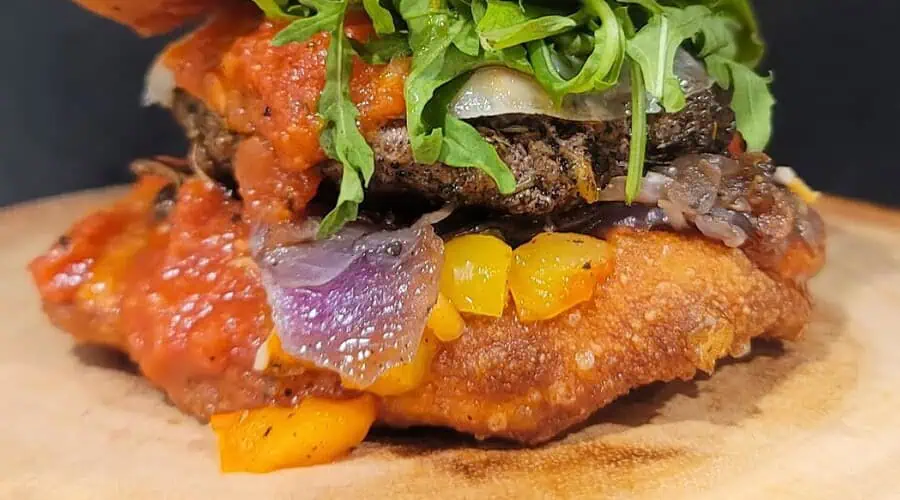Why choose between pizza or a Burger when you can have both? A juicy seasoned burger patty topped with peppery arugula, grilled peppers, onions and savory mushrooms. All melted together with creamy Mozzarella cheese. It’s finished with a rich pizza sauce and sandwiched between two pieces of deep-fried pizza dough for the ultimate crispy, chewy, saucy bite. It’s messy, indulgent and absolutely worth it.