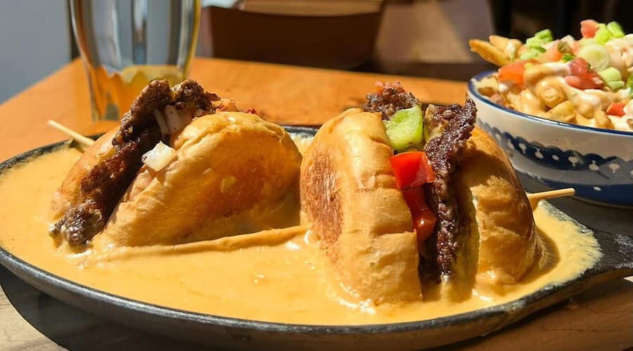 Two smashed house‑made beef patties layered with sautéed onions, peppers, and creamy Cholula, all stacked on an artisan bun and served in a skillet of bubbling hot Queso Cheese and served with fries.