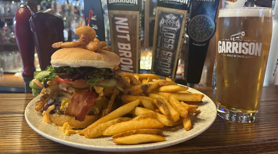 Brioche bun, 2 smashed fresh all beef patties, hickory brown sugar sauce , smoked cheddar , crispy bacon, topped with lettuce, pickled onions and crunchy Hickory sticks served either fries