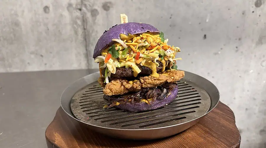 Beef patty, fried chicken, curry aioli, tangy tamarind glaze, red onion chutney and jungle slaw, on an ube brioche bun. Big BOLD juicy flavours!