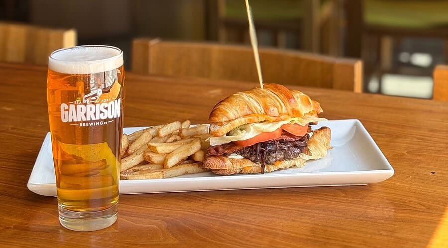 3 oz beef patty, bacon, lettuce, tomato, caramelized onion, dill pickle mayo, grilled cheese croissant bun, served with fries.