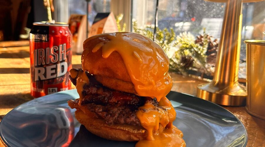 House Burger stacked with Memphis sweet BBQ roast pork, crispy onion ring, hot honey drizzle, Duke’s signature house made kettle chips and Garrison Irish Red beer cheese. Served on top of an Ace burger bun. Double the burger goodness in every bite. Add a side salad or house cut fries for $5. Paired perfectly with a Garrison Irish Red. Open @ 11.30am to 11pm 1Mon – Sun