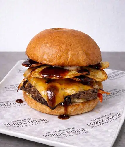A stacked burger with melted cheddar, sautéed onions and red peppers, and a layer of crispy kettle chips for bold crunch. Finished with roasted garlic aioli and a smoky whiskey BBQ drizzle on a toasted bun.