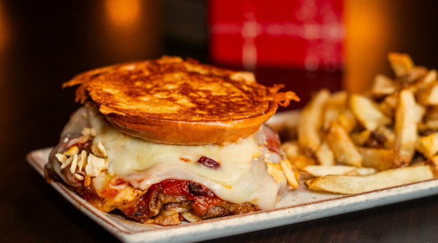 Two Atlantic beef smash patties layered with brown-butter onions, smoked tomato bacon jam, and a Goldfish cracker crumble, pressed between buttery grilled-cheese buns loaded with cheddar, gouda, and mozzarella. Served with fries.