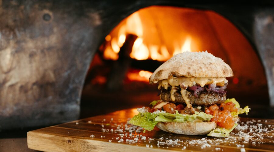 Freshmade all beef patty topped with a deep fried arancini ball, topped with romaine lettuce, tomato, grilled onions and TV sauce on our housemade Pizza Dough Bun (woodfired).