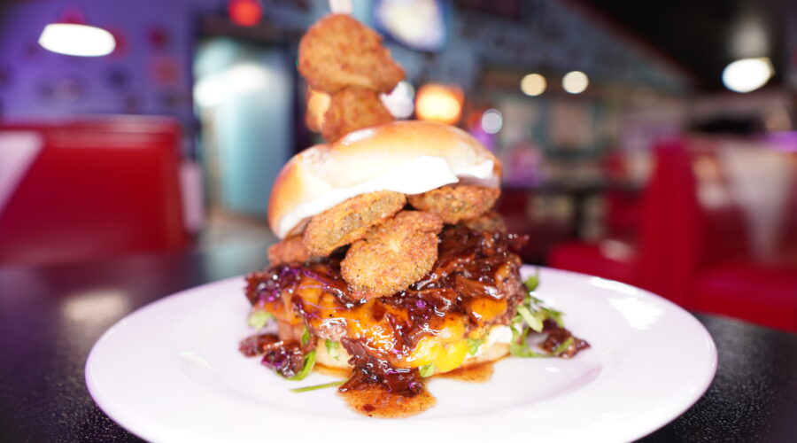Two old school onion smash patties, Canadian cheddar, hand breaded crispy dill pickle chips, cola bacon jam, shredded lettuce, garlic aioli