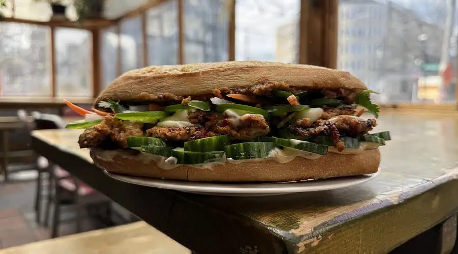 Quarter pound pork dumpling, smashed and chopped with melty white cheese, wave sauce, mushroom sesame duxelles, cucumber, jalapeno, cilantro and mixed pickles on a french roll