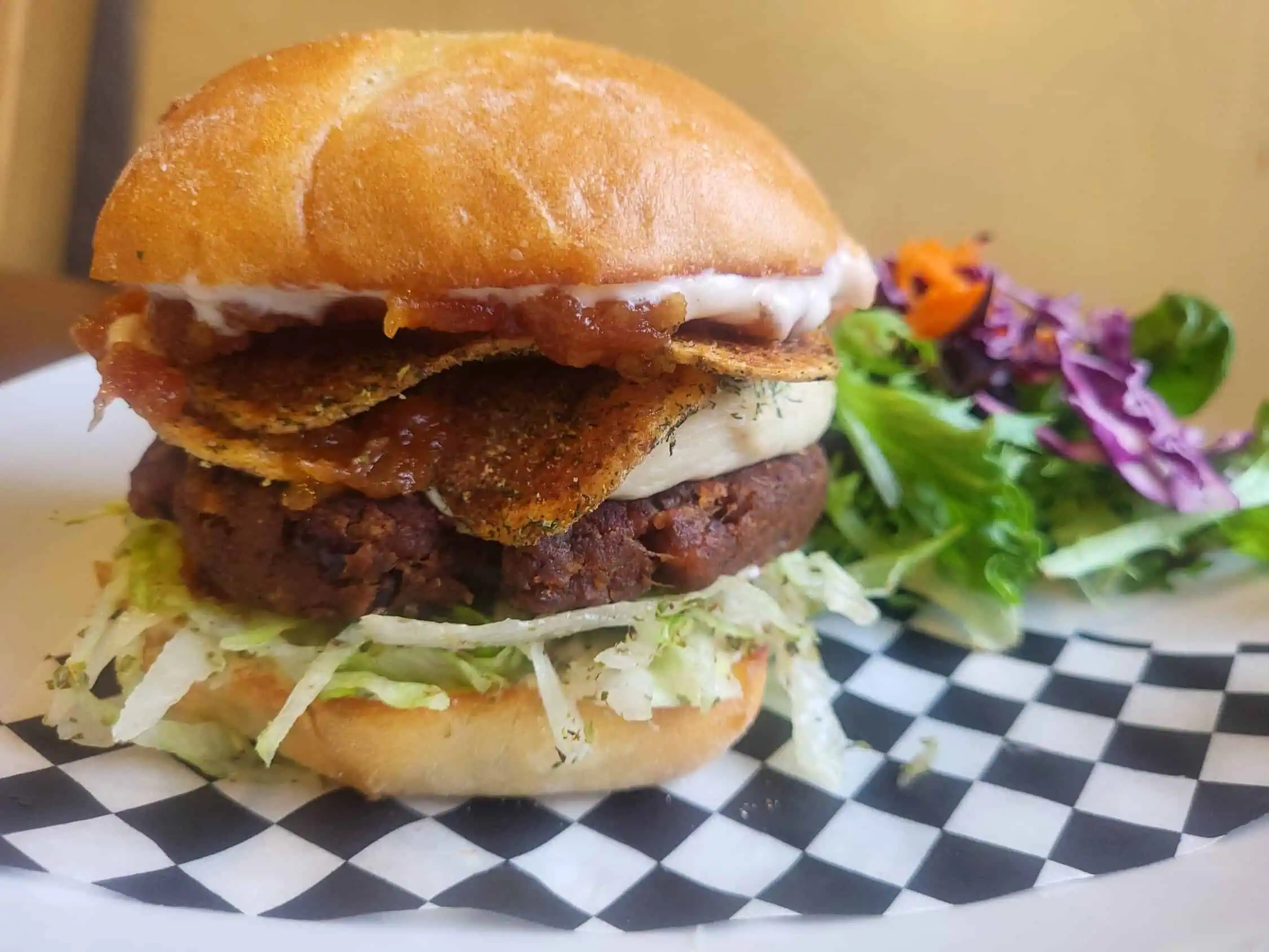 Meet the Vegan Crunch’n Munch! A thick pub-style black bean patty topped with creamy cashew mozzarella, caramelized onion and chipotle aioli, house-made dill pickle chips, crisp slaw, and sweet and tangy tomato relish. Served with your choice of potato wedges or house salad!